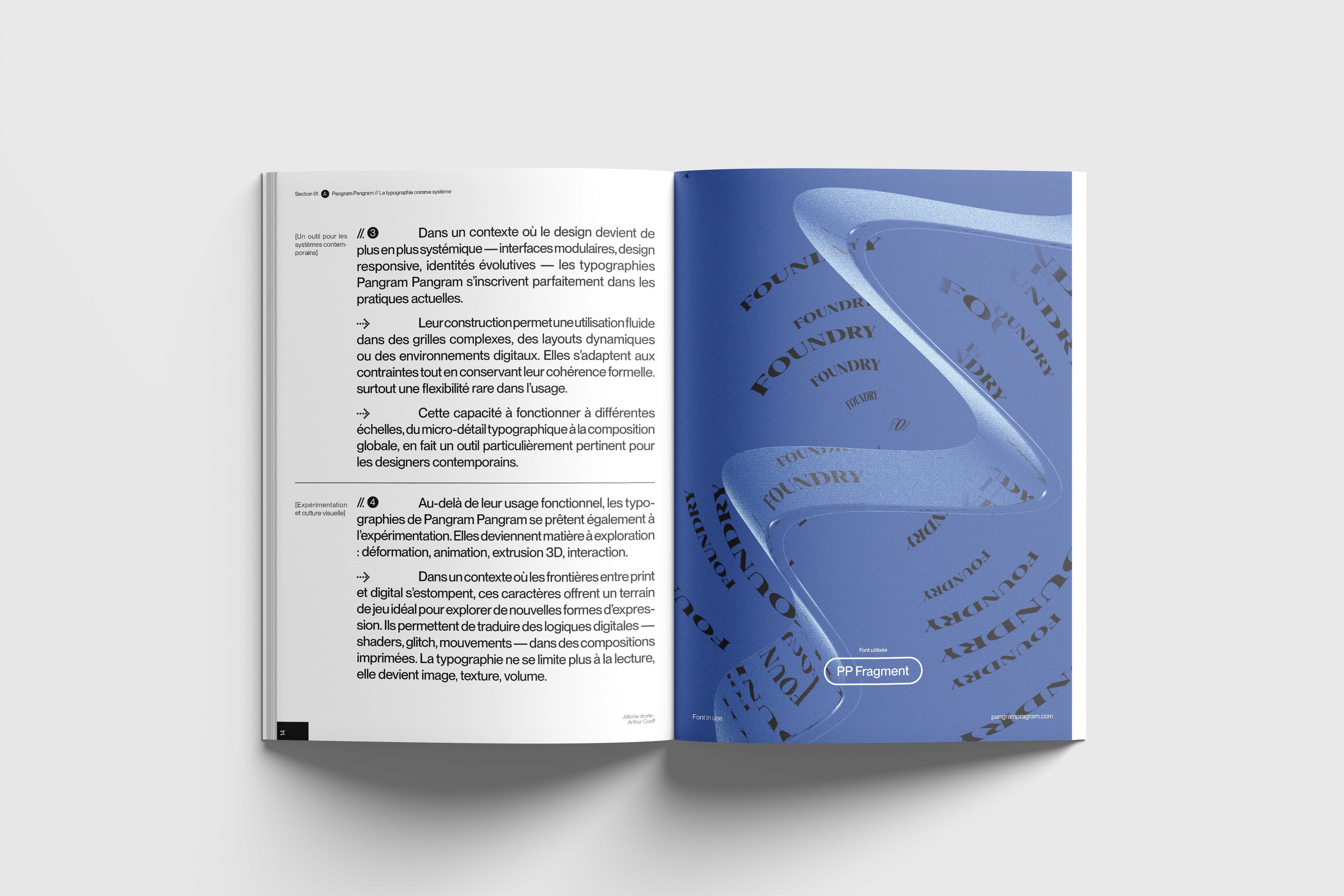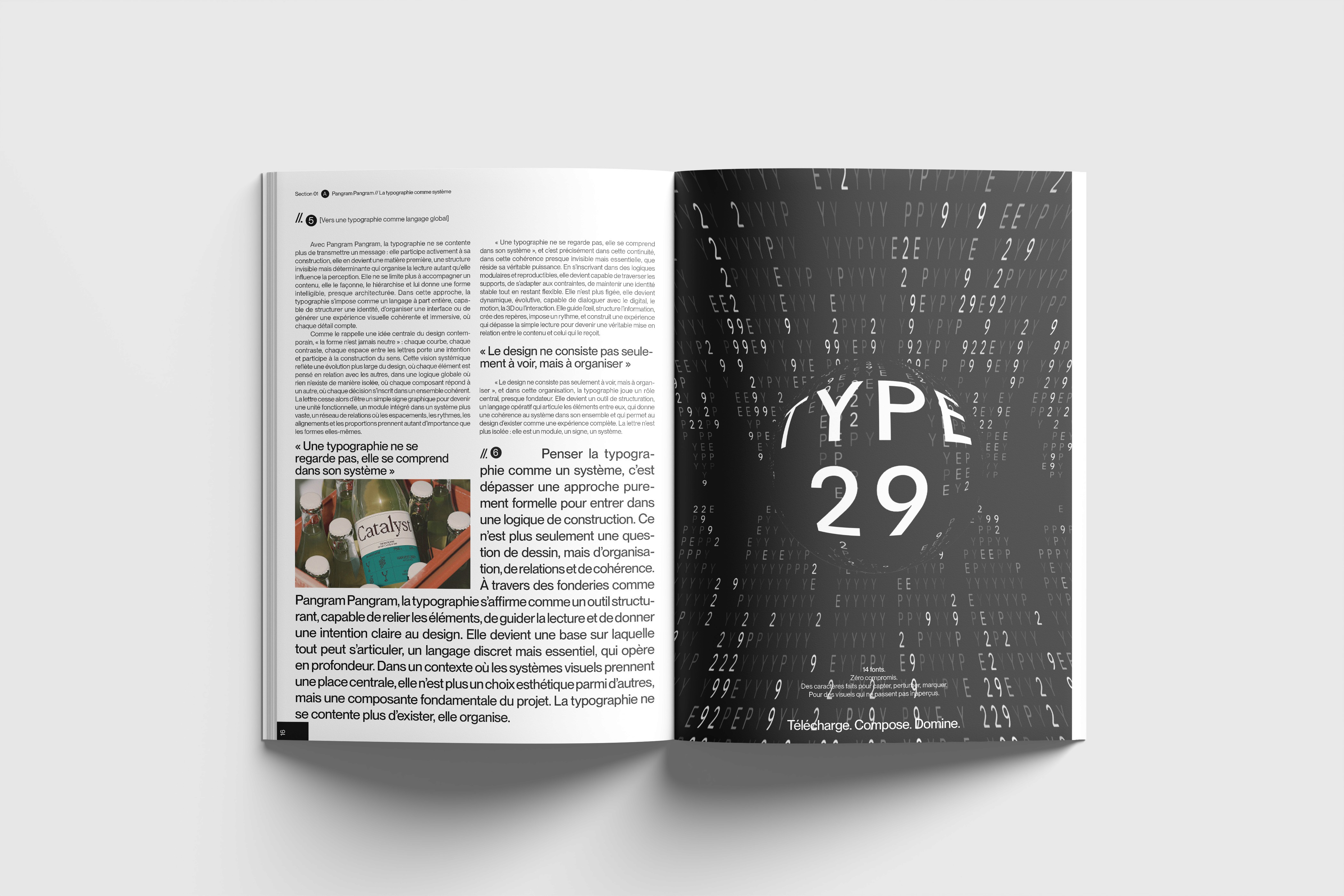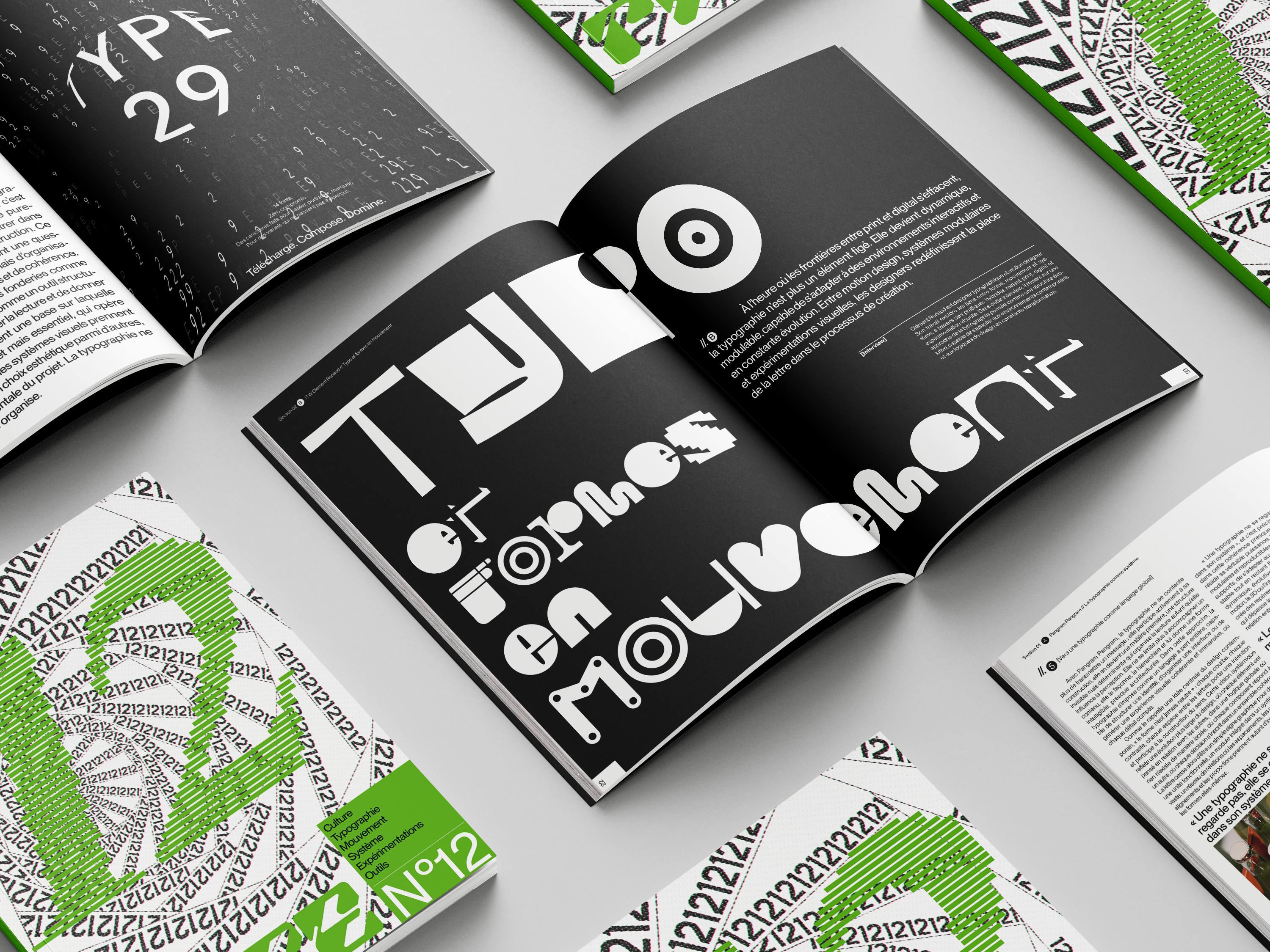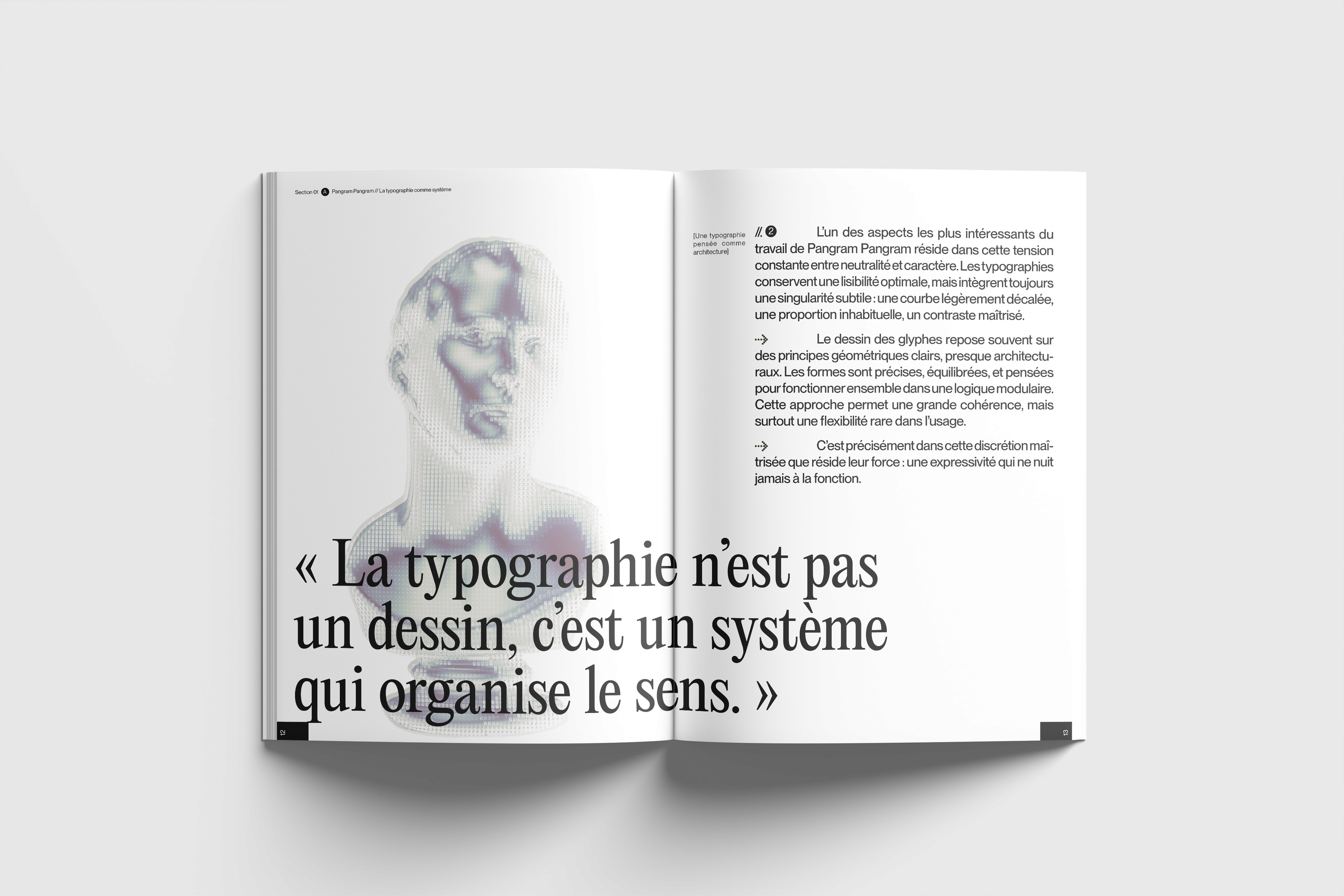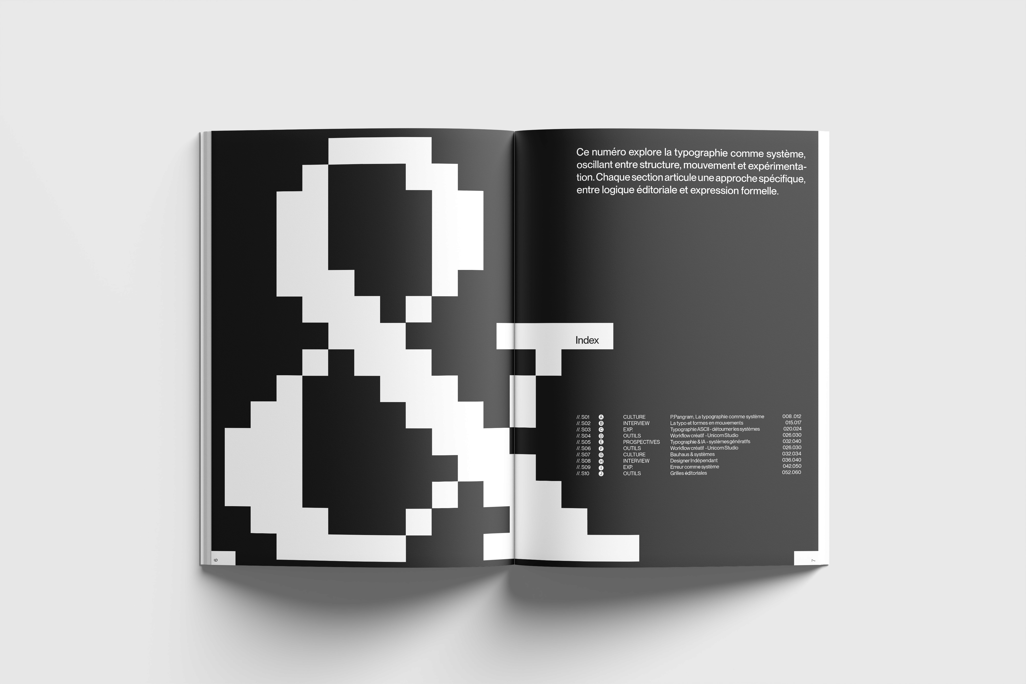 Un magazine typographique qui équilibre rigueur éditoriale et expérimentation visuelle, en traitant la typographie comme un élément central de la direction artistique.