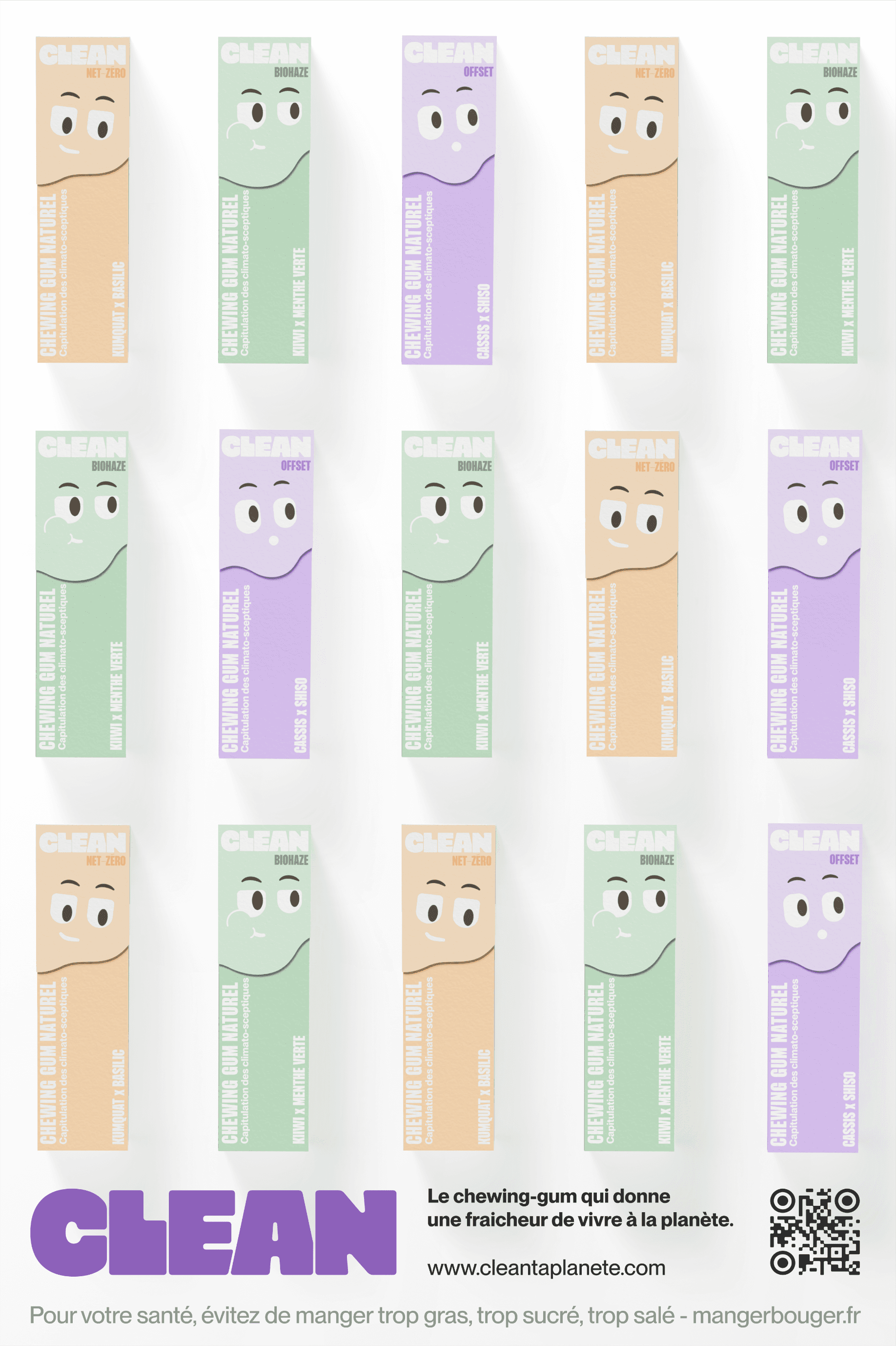 Clean est une marque de chewing-gum écoresponsable pensée comme un cycle complet, de la production à la fin de vie du produit. Le projet explore comment le design peut transformer un objet du quotidien en expérience écologique tangible, grâce à un chewing-gum biodégradable et un emballage en papier ensemencé qui peut être planté après usage.